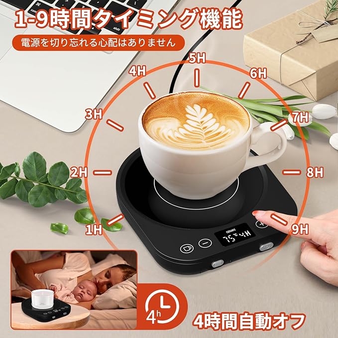☕【自動電源オフ 1-9H設定可能】 カップウォーマーは4時間後に自動で電源がオフになります。「+ /-」ボタンをタッチして、1~9 時間の自動オフ時間を設定できます。設定した時間後に自動的にオフになります。初期設定は4時間です。電源を切るのを忘れる心配がなく、安全に使用できます。