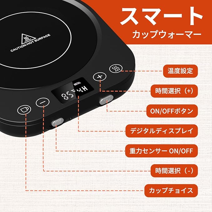 ☕【重力センサー機能 空焚き防止】 マグカップウォーマーには重力感知ボダンがあり、十分な重量を感知しないと運転しません。カップが乗せられないまま10分経過すると加熱機能が止まり、電源が切れる仕組みです。10分以内にカップを戻せば、前の設定したとおりに機能し続けます。カップの重量が300g未満の場合、或いは重力機能が気に入らない方は、重力センサーがオフにしても可能です。