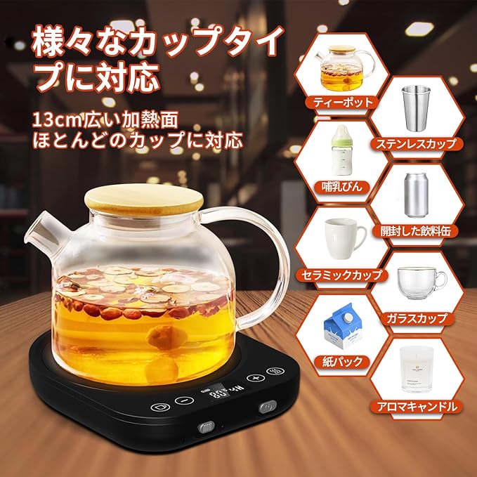 ☕【13cm広い加熱面 ほとんどのカップに対応】 カップ底の直径13 cm以内の耐熱グラス、セラミックカップ、ステンレスカップ、PPSU製哺乳瓶、ティーポット、箱入りミルク、開封した飲料缶、アロマキャンドルなどに対応可能です。保温効果はカップの素材によって異なります。カップの底が平らなタイプを選ぶとより速く温めることが可能です。ふた付きなら、保温性をより高める効果があります。