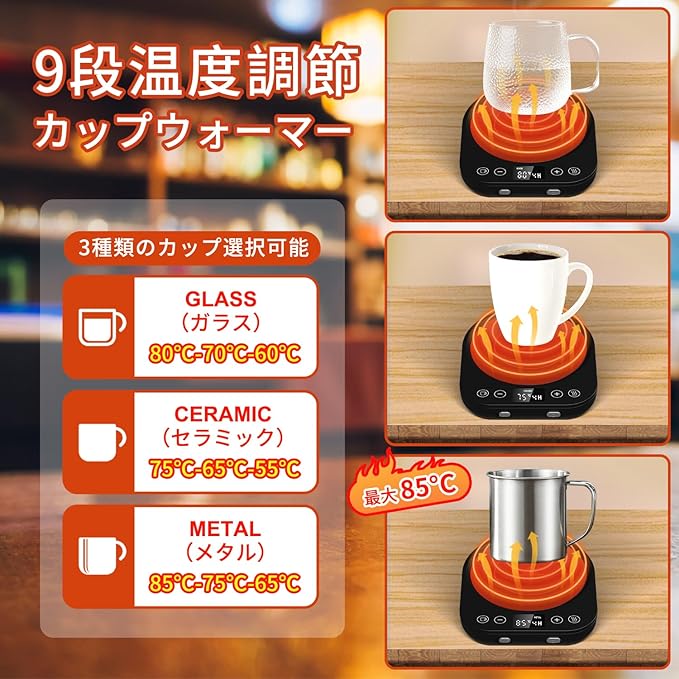☕【9段温度調節カップウォーマー 最大85 C】 カップウォーマーとは、電熱を利用してカップなどを温め、飲み物を保温するツールのことです。コーヒーカップウォーマーは3種類のカップを選択できます。各カップ種類は、高・中・低の三段階の温度調節が可能です。お好みに応じてタッチで温度レベルを切り替えます。 (ガラス:80℃-70℃-60℃) (セラミック:75℃-65℃-55℃) (メタル:85℃-75℃-65℃)。温度はこれら3つの素材のために特別に設定されています。カップの素材に合わせて、こまやかに加熱温度を設定できます。