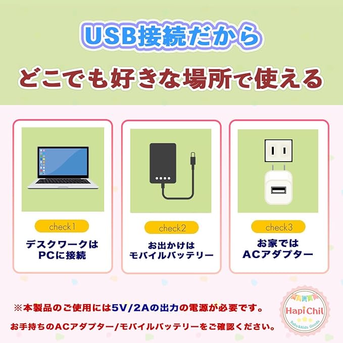 【USB接続】キッチンやリビング、お出かけ先など、どこでもお使いいただけます。