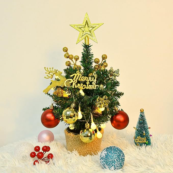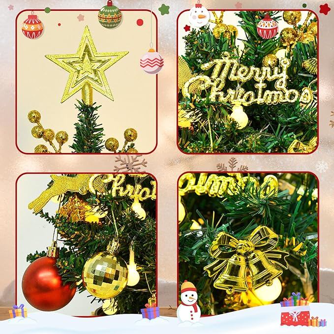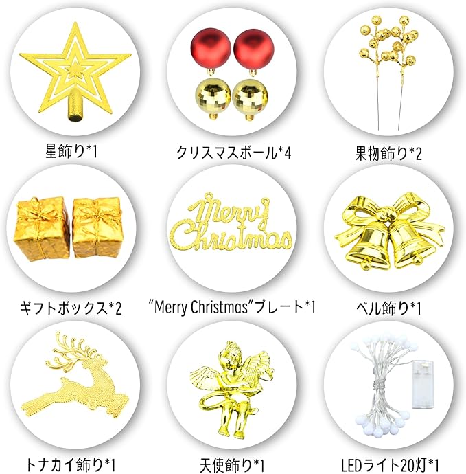 「自分だけのツリーを作ろう、心ときめくDIYデコ」 ゴールドボールやレッドボール、果物飾り、ギフトボックス、星・ベル・天使・トナカイのオーナメント、そして“Merry Christmas”プレートまで、華やかなデコレーションが勢ぞろい。20LED ストリングライトがやさしく輝き、あなただけの特別なツリーを一層美しく演出します。自由に飾り付けを楽しみながら、世界にひとつだけのクリスマスツリー 卓上を完成させましょう。