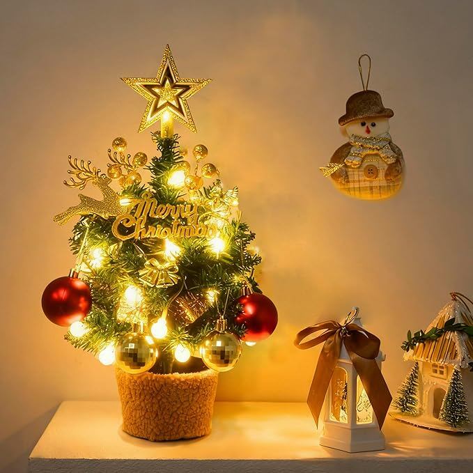 「クリスマス気分満載のミニツリー」 コンパクトながら存在感たっぷりのクリスマスツリー。繊細なオーナメントと柔らかなイルミネーションライトが織りなす光のハーモニーで、空間を一瞬でクリスマスムードに包み込みます。やさしく灯る光がまるで雪のようにきらめき、見るたびに心がほっと温まる――そんな特別なひとときをお楽しみください。