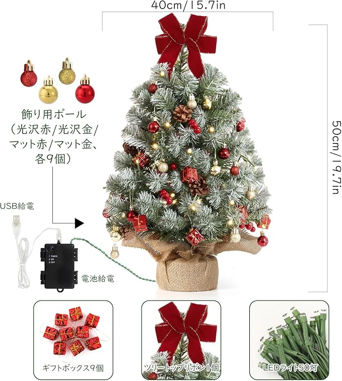 クリスマスツリー 卓上 ミニ Luxspire 50cm DIY可能 人工松 タイマー機能 電池式 USB給電式 2ways給電 LEDイルミネーションライト 人工 クリスマスつりー 小さめ クリスマス雑貨 デスクライト インテリア プレゼント 雰囲気 デコレーション おしゃれ ミニクリスマスツリー 40*40*50cm