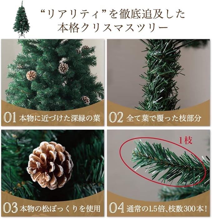 1、『圧倒的な枝数』通常のクリスマスツリーと比較して枝数は約1.5倍!120㎝サイズのツリーの枝数は300本、150㎝サイズのツリーの枝数は450本、180㎝サイズのツリーの枝数は800本、210㎝サイズのツリーの枝数は1200本です。