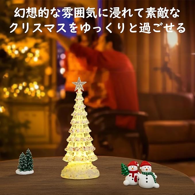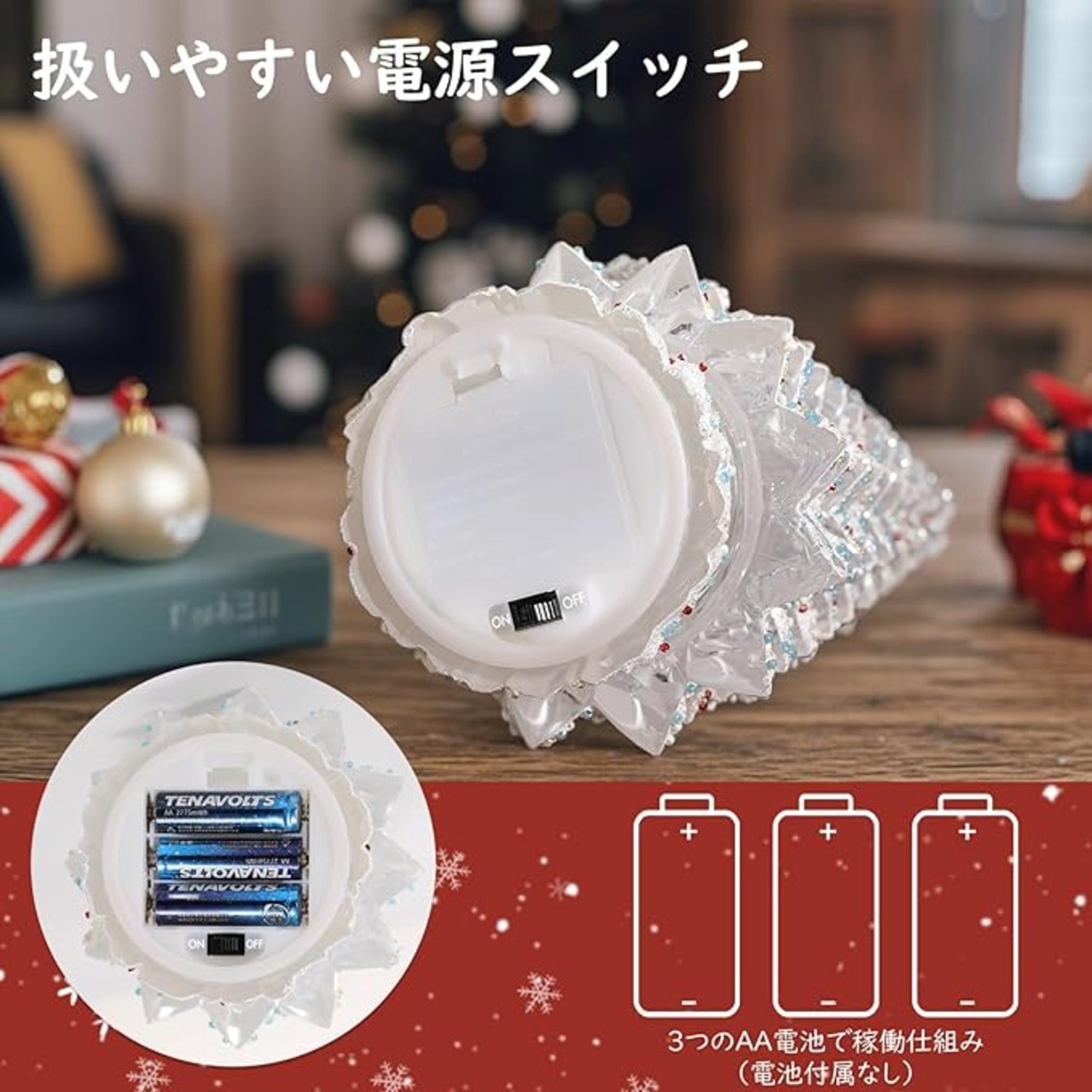 「上質な素材採用したコンパクトな仕様」ガラスより割れにくい耐久性に優れたアクリル素材を採用しており、色あせもなくより長く楽しめます。3つのAA電池で手軽にお部屋の雰囲気を変われます。様々な場所にインテリアとして置くだけで、目が付くたびに癒やされます。パッケージから出した際にすぐ飾れますので、大きなクリスマスツリーを置けないお部屋や、飾り付けやオーナメントの収納に手間を掛けたくない方に大変おすすめする逸品です。