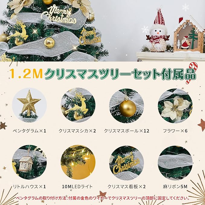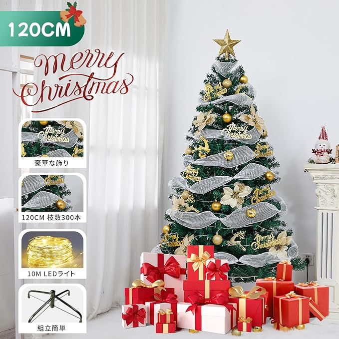 120cm クリスマスツリー セット christmas tree 高濃密度 枝数300本 10mLED飾りライト/5mリボン付き 組立簡単 収納便利 クリスマス飾り セット 豪華 北欧風 屋内/外 商店 部屋 クリスマスグッズ 日本語説明書付き