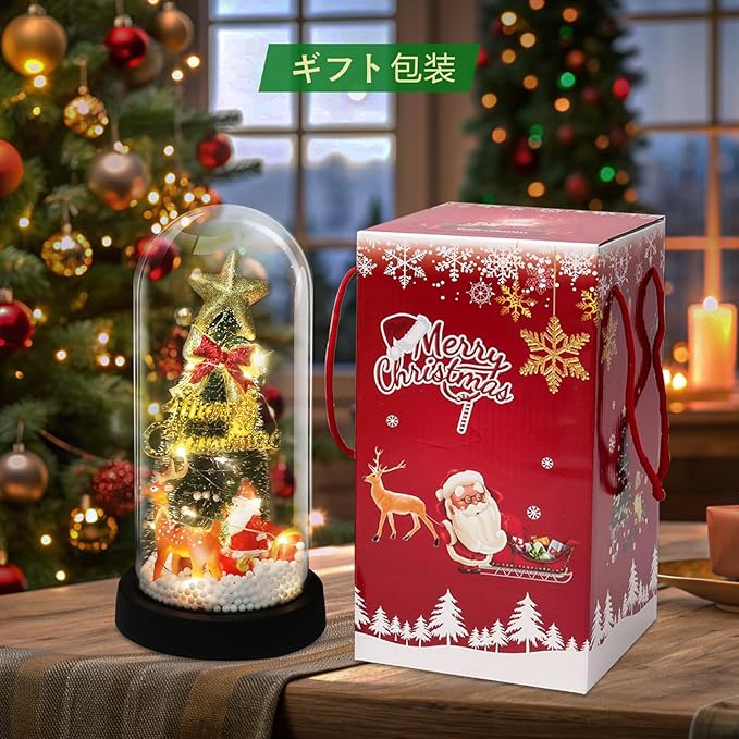 【2025年新型卓上クリスマスツリー】ミニクリスマスツリー、鹿、サンタクロース、クリスマス看板、ガラスドーム、トップ星やLEDライトから構成されたクリスマスグッズは、暖かいクリスマス雰囲気を演出します。 透過率の高いガラスドームの中に、LEDライトに絡まれたクリスマスツリーがキラキラします。