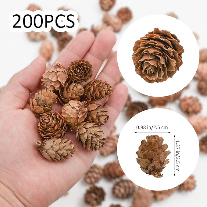 ミニ松かさは200個セットです。DIY工芸、クリスマス、祝日の装飾に最適です。センターピース、花瓶の詰め物、カバン飾り、キーホルダー、アロマキャンドル、テーブルセンタピース、クリスマスの吊り下げ飾りなどの手作り物の作成には適しています。