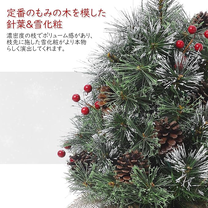 【松ぼっくりとホーリー付きでリアルな雰囲気】本物のような質感の枝葉に、松ぼっくりとクリスマスホーリーをあしらい、近くで見ても楽しめるこだわりのデザイン。飾り付けが苦手な方でも、箱から出すだけでバランスの取れた可愛らしいツリーが完成します。