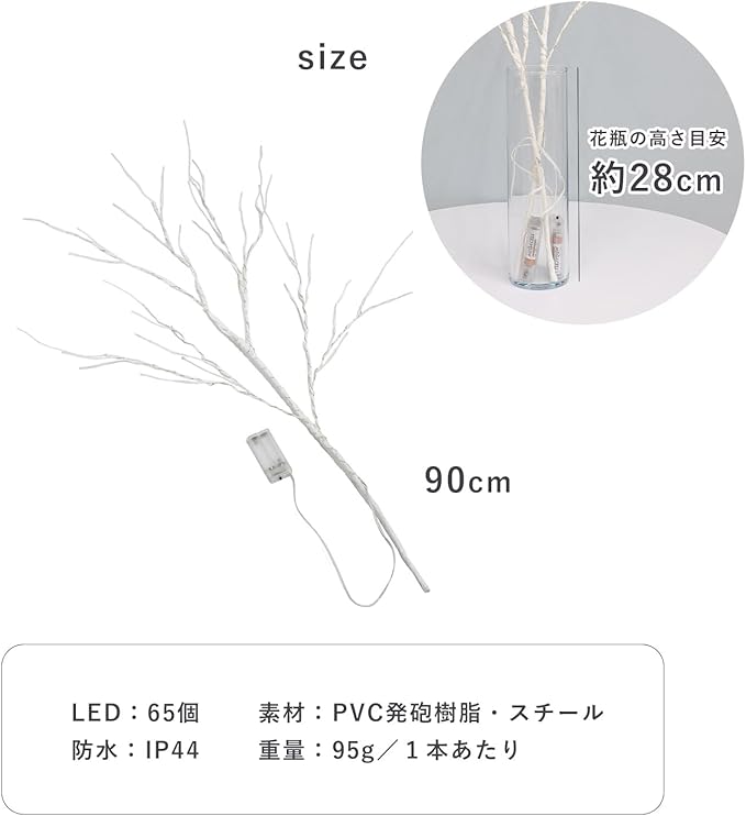 【素材】PVC発泡樹脂・スチール 【サイズ】高さ90cm、重量:95g 【仕様】LED:65個、防水:IP44、単三電池:2個(別売り)