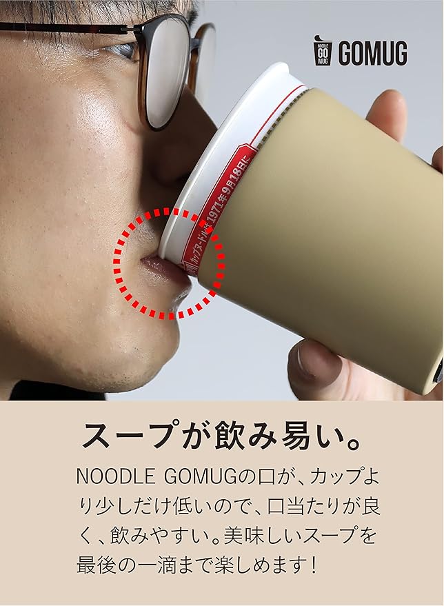 スープが飲みやすいポイントはNOODLE GOMUGの口が、カップより少しだけ低いので、口当たりが良く、飲みやすい。美味しいスープを最後の一滴まで楽しめます!