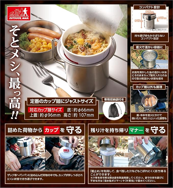 OUTDOOR MAN(アウトドアマン) カップ麺クッカー MAMORU-MEN 定番のカップ麺にジャストサイズ 直火で湯沸かしフタを使って調理可能 調理に便利な目盛り付き KOGR-007V