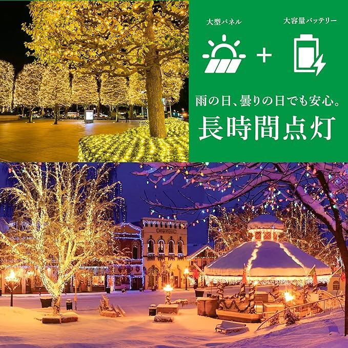 【電源不要!エコでコスパ最高!】 玄関先やガーデンを、美しい光でおしゃれにデコレーションする**「ソーラーイルミネーションライト」**。屋外用LEDイルミネーションとして、昼間にソーラーパネルが太陽光を電力に変え、夜間に自動で点灯します。配線不要で設置が簡単!直射日光の当たる場所にソーラーパネルを設置するだけで、夜には幻想的なイルミネーションが楽しめます。防水LEDライトなので、雨の日も安心。電気代がかからず、環境にも優しいので、家庭でも商業施設でも大活躍です。