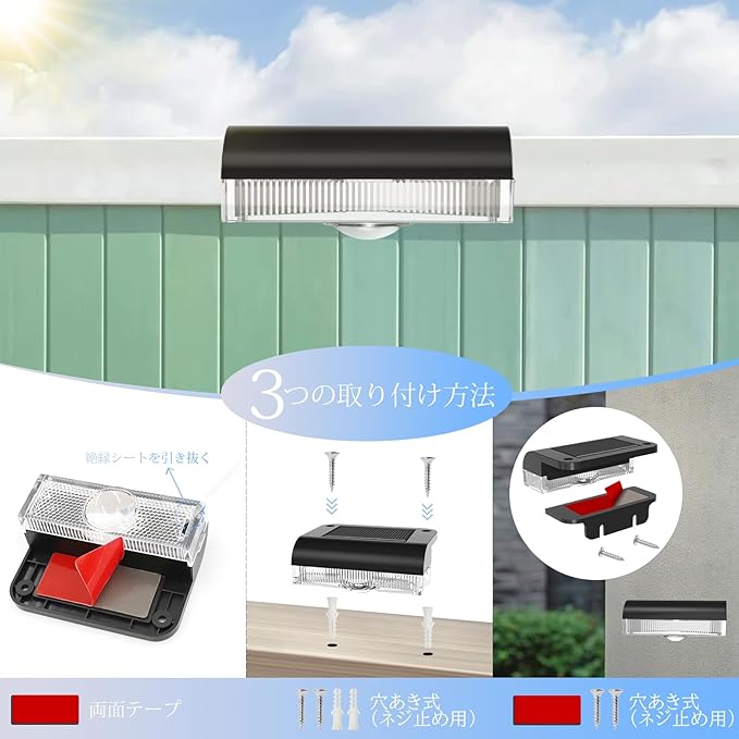 【簡単設置】コンパクトで軽量、電線不要。付属のネジで玄関やデッキ横の木製フェンスに取り付け、または付属の両面テープで貼り付け可能。専門工事不要で手間とコストを節約できます。