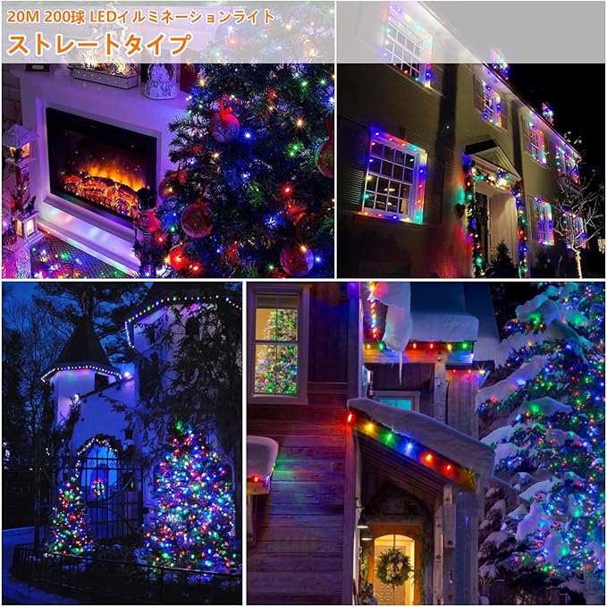 LEDイルミネーションライト ストレート 20M 200球 LEDストリングライト 屋外 防水 8点灯パターン 記憶メモリー付き タイマー機能 複数連結可 キャンプ用 ガーランドライト ハロウィン装飾 フェアリーライト クリスマス/ハロウィン/パーティー/新年/祝日/結婚式/庭対応 飾りライト 屋外 照明 屋外用LEDイルミネーション ライト クリスマスツリー ライト