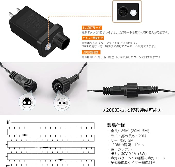 【業務用に最適の連結機能】オス、メスのプラグをつないでキャップを締めるだけで簡単に接続できます。同商品との連結も可能で、「ライトの長さが短い」「コンセントが足りない」など、飾り付けの”困った”を即解決するよ! 連結機能を使いこなして、より快適にイルミネーションを楽しみましょう。連結には、連結タイプごとに連結できる電気容量の制限があります。そのため、ライト同士を複数連結する際には、連結するライト全体での消費電力(W)を確認する必要があります。★最大2000LEDまで連結可能です★