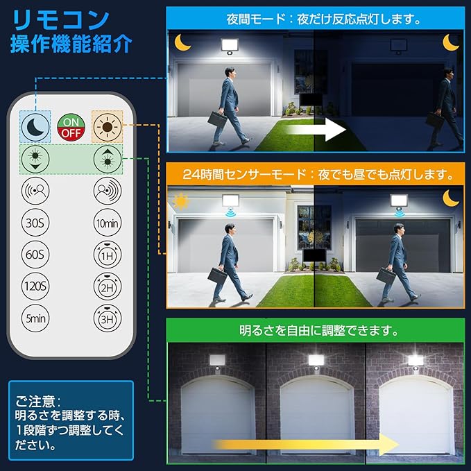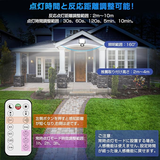 [リモコン操作で便利&自動点灯・消灯機能]このLEDライトはリモコン付きで、離れた場所からでも簡単に操作でき、手軽にオン・オフを切り替えることが可能です。さらに、人感センサーを搭載しており、人の動きを検知すると自動で点灯・消灯します。手動での操作が不要となり、便利なだけでなくエネルギー効率も向上。玄関先やガレージなど、特に手が離せないシーンや不意の来客時にも便利に使えます。