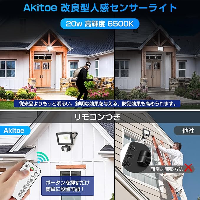 [超高輝度&昼白色6500Kで広範囲を照射]この20WLEDセンサーライトは、昼白色6500Kの光を発し、自然な明るさを提供します。6500Kの光は、昼間のような白く明るい光で、特に広い範囲を照らすのに最適です。高輝度のLEDライトは、夜間や薄暗い場所でもクリアな視認性を確保し、駐車場、庭、玄関、ガレージなど、幅広い場所で活用できます。省エネ性能も備えているため、消費電力を抑えつつ長寿命で経済的です。