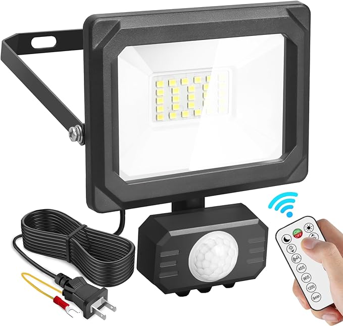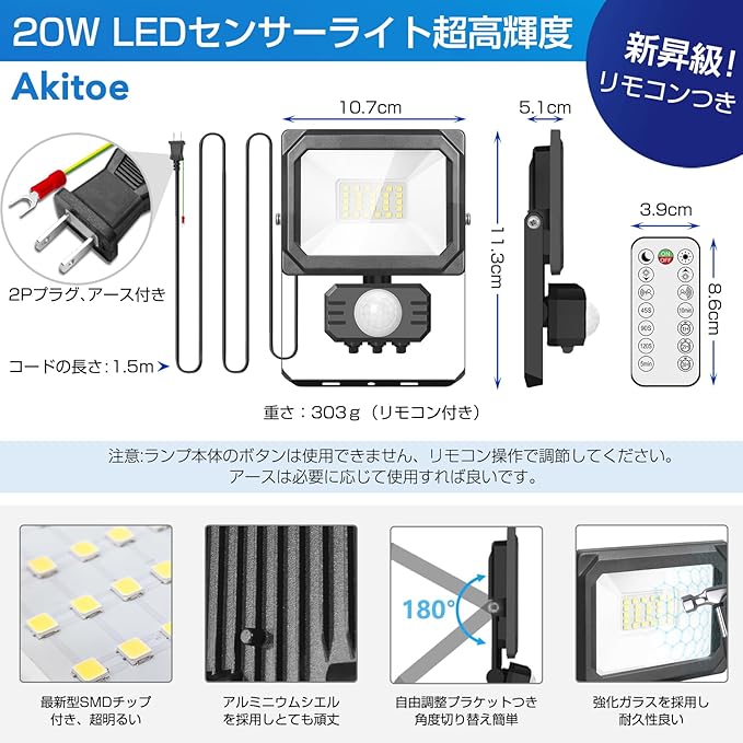 LEDセンサーライト 屋内/屋外使用可 人感センサー LED投光器 20W 昼白色 6500K 2Pプラグ フラッドライト 100V リモコン操作 自動点灯/消灯 超高輝度 IP65防水仕様 爆光 防犯ライト ガレージ 庭 玄関 倉庫 駐車場 1.5Mコード コンセント付き