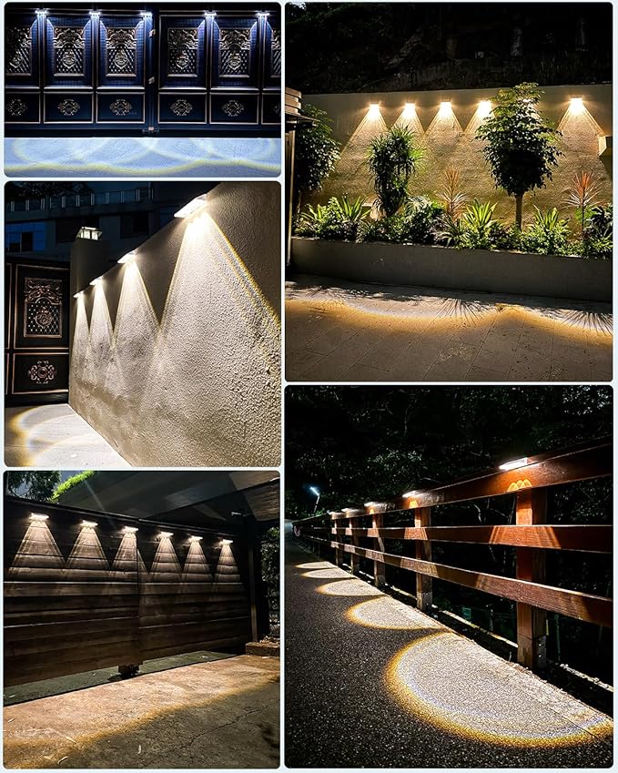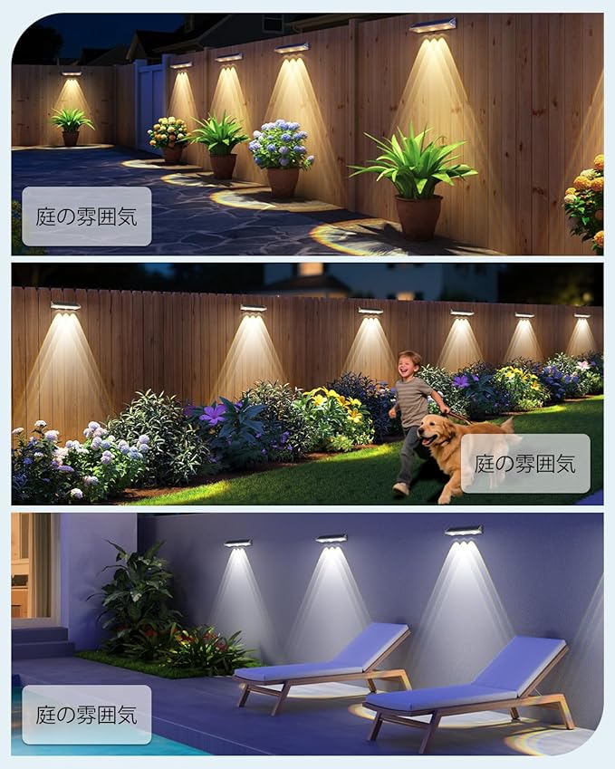 【広範囲照射&高輝度LED】高輝度LED3灯と高透過レンズで、照射範囲が他社のソーラーフェンスライトより40%広く。壁面から流れ落ちるような美しい光の輪が、複数のライトで重なり合い、おしゃれな雰囲気を創り出します。通路や庭、ガレージ周りを安全に照らします。