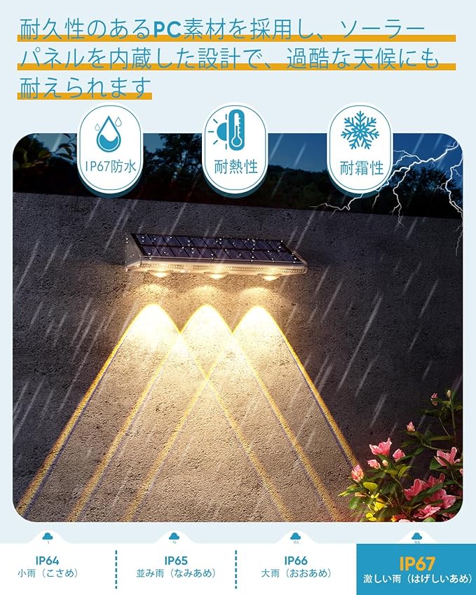 【IP67防水耐候性&強化素材】紫外線に強い強化PC素材を使用し、耐高温・耐衝撃性に優れています。超音波溶着技術によるIP67防水防塵等級を実現し、厳しい気候でも一年中安心してお使いいただけます。