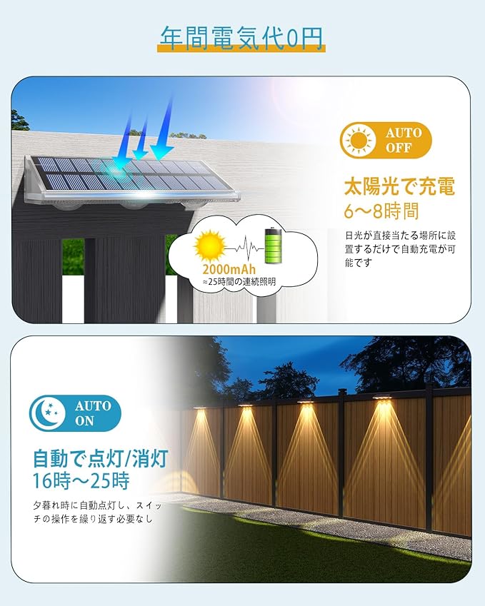【全夜点灯&簡単取り付け】大容量2000mAhバッテリー搭載で、省エネモードなら16-25時間連続点灯可能(6-10時間の直射日光充電が必要)。付属の取付キットでフェンスや壁に数分で設置完了、配線工事は不要です。