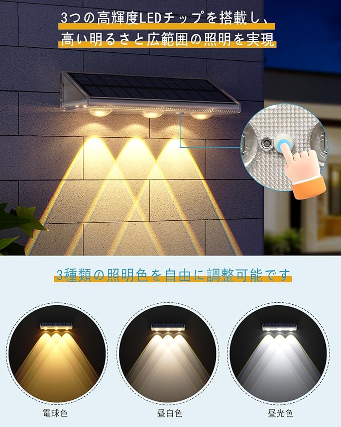 【3つの調光モード&自動点灯/消灯】電球色/昼白色/昼光色の3色調節可能な環境光で、おしゃれな屋外空間を照らします。内蔵光センサーにより、日暮れ時に自動点灯、夜明けに自動消灯。完全ソーラー充電式のため、電気代0円でエコな照明を実現。