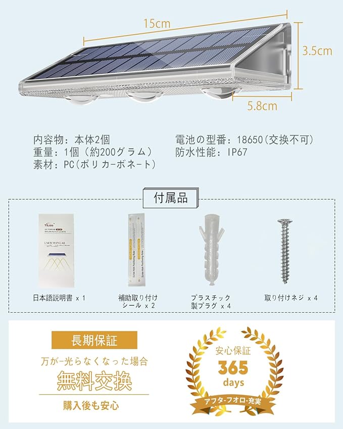 【365日品質保証&使用時のコツ】365日の品質保証をご提供(人為的損傷以外は無償交換)。最高の性能をご利用いただくには、直射日光が当たる場所に設置してください。注:雨天や曇天が続くと、明るさや点灯時間が低下する場合がありますが、日照が戻れば自動的に通常運転に戻ります。