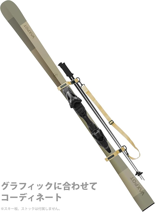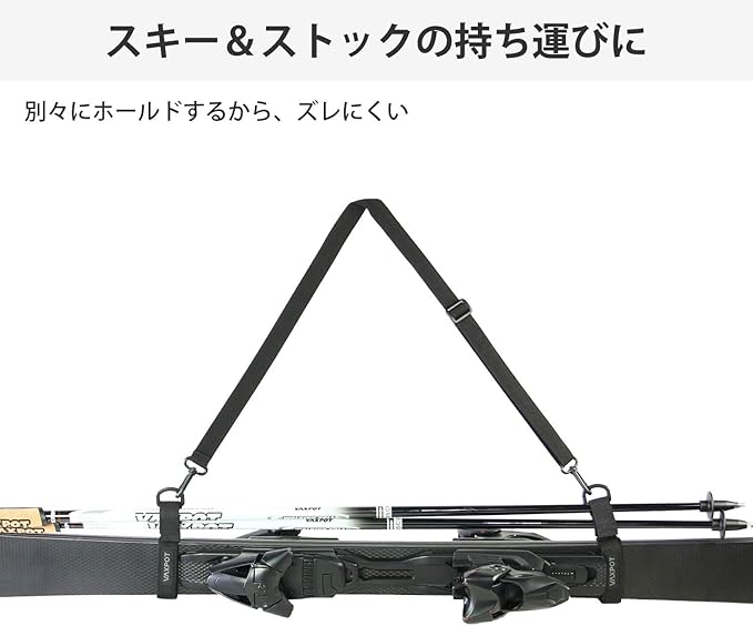 スキーとストックの持ち運びに便利なスキー用のキャリーベルト。