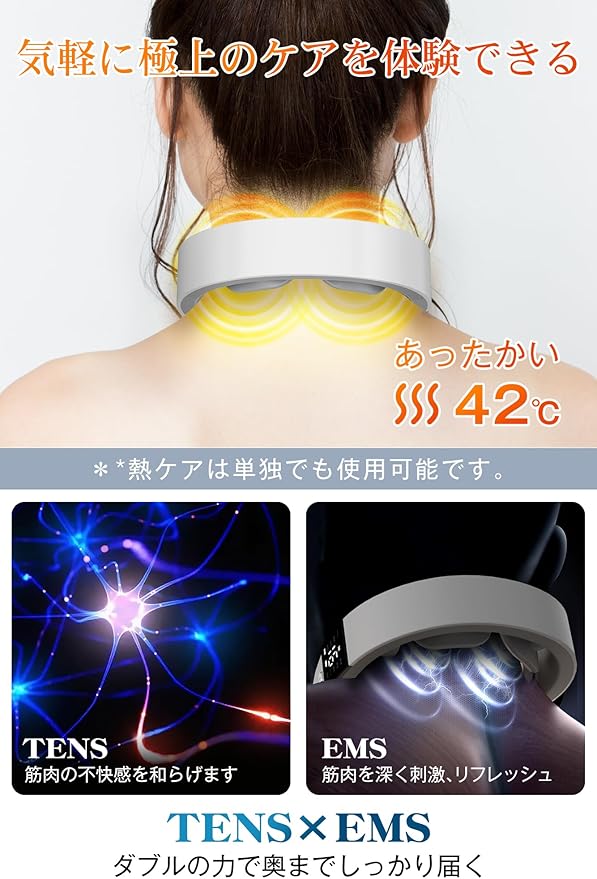 【最新設計の首リラクゼーション器&機能UP・装着感UP】★首の後方の「パルス・加熱パッド」と ★首の側方の「振動パッド」で首周りをを広範囲にケアしてくれる!後方にパルス刺激(TENS EMS)とヒーター機能のダブルの力で、僧帽筋(首を支えている筋肉)を刺激してほぐします。同時に首の側面の胸鎖乳突筋(肩の違和感に繋がる)に心地よい振動が届き、。また、デザイン面、✩✩✩従来と違った薄型デザイン採用でひとクラス上のフィット感を実現しました。