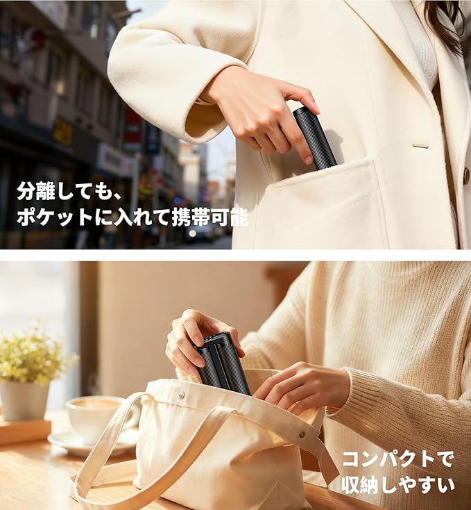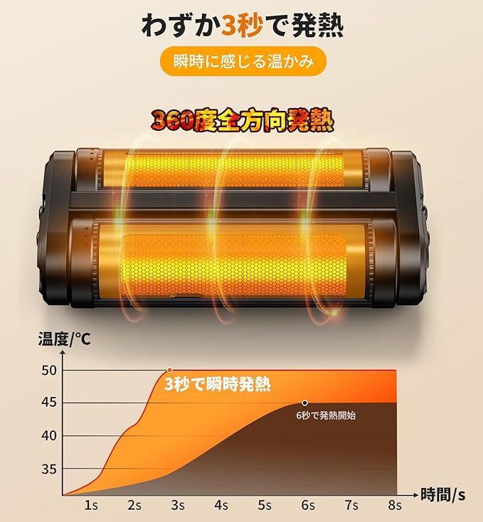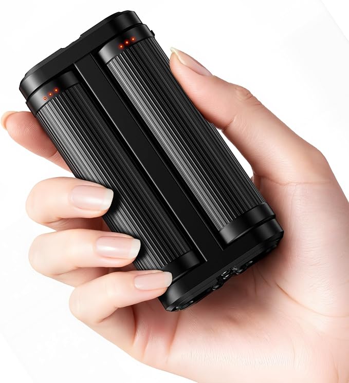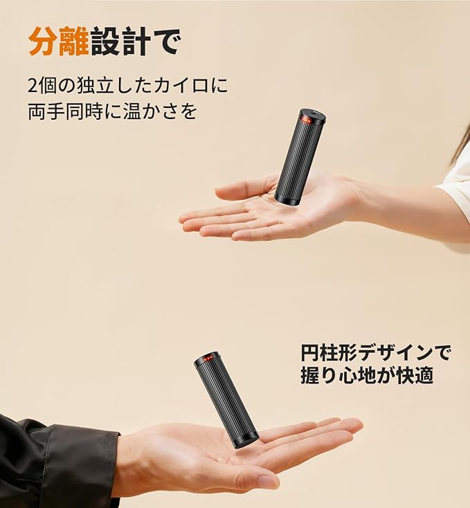 「全方向発熱・分離共有」先進的な碳素水晶発熱体を内蔵したこの充電式カイロは、電源を入れてからわずか3秒で素早く温まり始めます。従来の片面だけが熱くなる暖房器具とは一線を画し、独自の円筒形デザインが360 全方向から均一に熱を放射します。手のひら全体を包み込むような均一な温かさを実現し、指先までしっかり温めます。極寒の屋外でも、素早く体温を回復させ、凍える手を優しく癒します。さらに、上下ボタンを同時に押すだけで、1台の装置が2つの独立した電気カイロに簡単分離。おひとりで左右の手を別々に温めることも、友人やパートナーと暖かさをシェアすることも可能です。