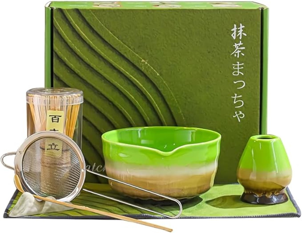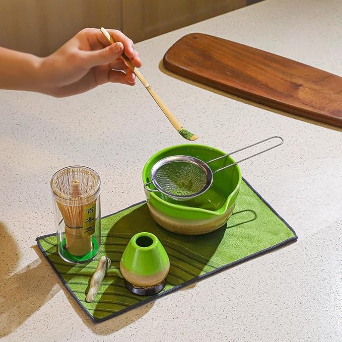 【初心者向け七点セット】抹茶碗(まっちゃわん)、茶筅立て(ちゃせんだて)、百本立て(ひゃっぽんだて)、茶杓(ちゃしゃく)、茶漉し(ちゃすり)、置物(おもの)、茶巾(ちゃきん) 【茶碗は尖った口のデザイン】このような設計により、お茶を注ぐ際のこぼれを防ぎ、こぼれてしまう窘め(きょうめ)を避けることができます 【巨匠設計】抹茶碗は名匠によりデザインされ、抹茶本来の芸術性と一体感を十分に発揮しています 【セット全体は】すべて天然の竹と高品質のセラミックで作られています。無毒、無臭、環境にやさしい天然竹素材で作られています。
