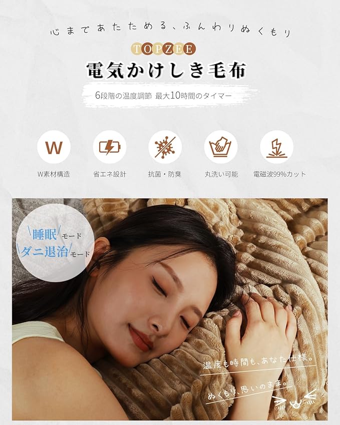 【人気雑誌『andGIRL』2025年秋号掲載】【シリーズ累計10万枚突破の電気毛布がさらに進化!】 TOPZEE 掛け敷き兼用 電気毛布、新たな目覚め。厚み1.2倍を実現した新生電気掛け毛布が登場。肌が求める極上のふわとろ感触は、高密度織りとロングパイルが織りなす匠の技術。従来品の毛足の約2倍となる極細繊維が、空気をたっぷり包み込み、まるで雲に包まれるような心地よさを実現しました。 ✓ 「睡眠モード」搭載--38℃で6時間持続。睡眠中の过热を防ぎ、快適な体温環境を維持。 ✓ 「ダニ退治機能」──布団に挟んで高温設定で約2時間通電することで、ダニ退治ができます。今年の冬を優しく過ごすための、たっぷり厚手で機能性に優れた掛け 敷き 電気毛布。TOPZEEの新たな定番が生まれました