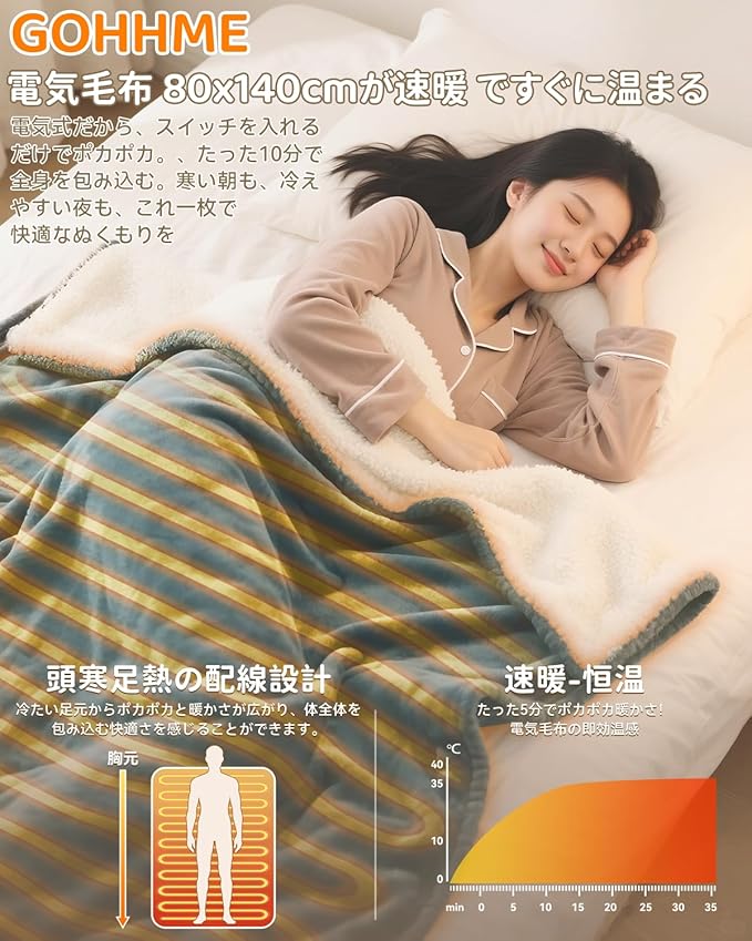【5分即暖&スマート恒温加熱機能省エネ設計で冷え性対策革命の次世代型電気敷き掛け毛布】高品質カーボンファイバー採用で「30秒で温かさを実感」→「5分で全身がじんわり温まる」驚異の速暖性電気膝掛けです!寒い夜もすぐに快適な温度を提供してくれます。進化版コントローラーは操作簡単で「ボタンが効かない」「設定がわかりづらい」といった不満を解消!直感的な操作で「ワンタッチで最適温度」に調整可能。高齢者の方や学生でも簡単に使えます。そして昨年の「せっかくの電気毛布が使えない!」「電源が入らない」「ボタンが反応しない」という不便も解決します!その上に、スマート恒温加熱機能も備えており、始動時は全出力で加熱し、設定温度に達すると加熱を一時停止します。温度が低下し始めると、再び加熱を再開します。温度が安定した後は、温度は一定に保たれ、、設定した温度を自動的にキープし、また細かい温度調節により「電気代を最大30%削減」を実現しくれます。また、自動電源オフ機能を付き、つけっぱなしでも安心の経済設計です。