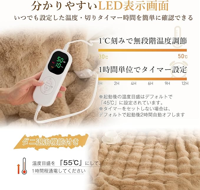 【ダニ対策】電気毛布のダニ退治機能は、主に高温を利用してダニを駆除する役割を果たします。電気毛布 敷きは「ダニ退治モード」が搭載されており、このモードを起動すると、電気毛布は一定時間(通常は 2~6 時間程度)、ダニの生存に適さない高温(約 50℃前後)に設定された領域を均一に加熱します。 また、この高機能な電気毛布では、高温加熱に加えて、銀イオンなどの抗菌成分を布地に配合することで、ダニの繁殖を長期的に抑制する効果も付加しています。使用時には、ダニ退治モードの動作時間や推奨使用頻度(例:1 ヶ月に 1~2 回)を製品の説明書に従って確認し、安全かつ効果的に利用することが重要です。