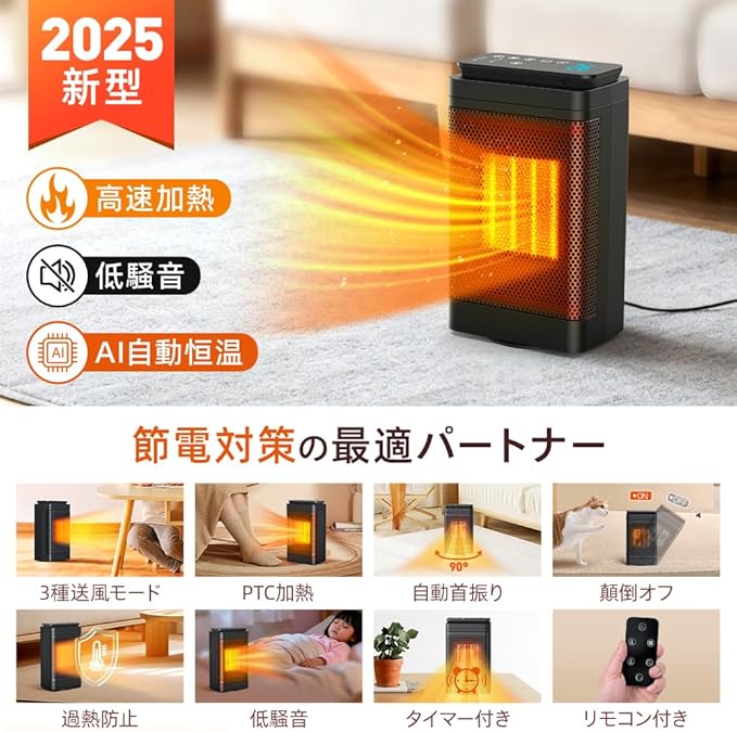 【2025冬の新定番|速暖・省エネ・AI恒温】 セラミックヒーター 小型 ヒーター 足元 大風量 電気ストーブ セラミック ファンヒーター 電気 8W 600W 1200w 3段階温風 省エネ 暖房器具 タイマー付き 首振り 室温センサー AI恒温モード タッチパネル&リモコン付き 液晶表示 顛倒OFF 過熱防止 コンパクト マイナスイオン 脱衣場 節電 洗面所 リビング 寝室 家庭用 6畳~