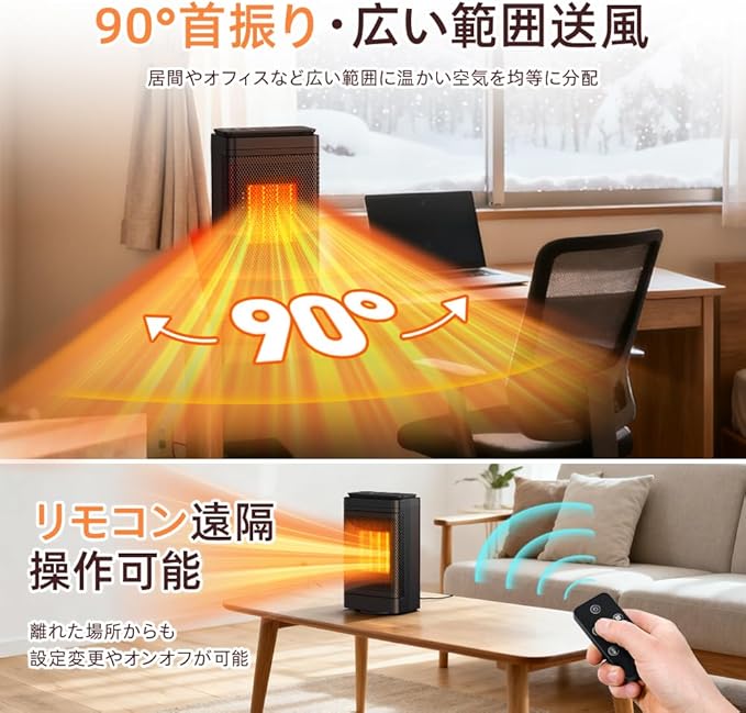 【3段階風量調節・90 自動首振り】高温(1200W)・低温(600W)・送風(8W)の3モードを搭載し、季節や時間帯に応じて自由に切替可能な ミニヒーター 。広範囲に暖かさを届ける90 自動首振り機能により、部屋全体を均一に暖めます。冷気が溜まりやすい足元までしっかり暖まり、空気循環にも最適。送風モードを使えば夏場のサーキュレーター代わりにも活躍します。 コンパクトヒーター リモコン付きで、離れたソファやベッドからでも簡単に温度・モードを操作できるのも便利。1台でオールシーズン対応、快適さと使いやすさを両立した万能 ヒーター です。