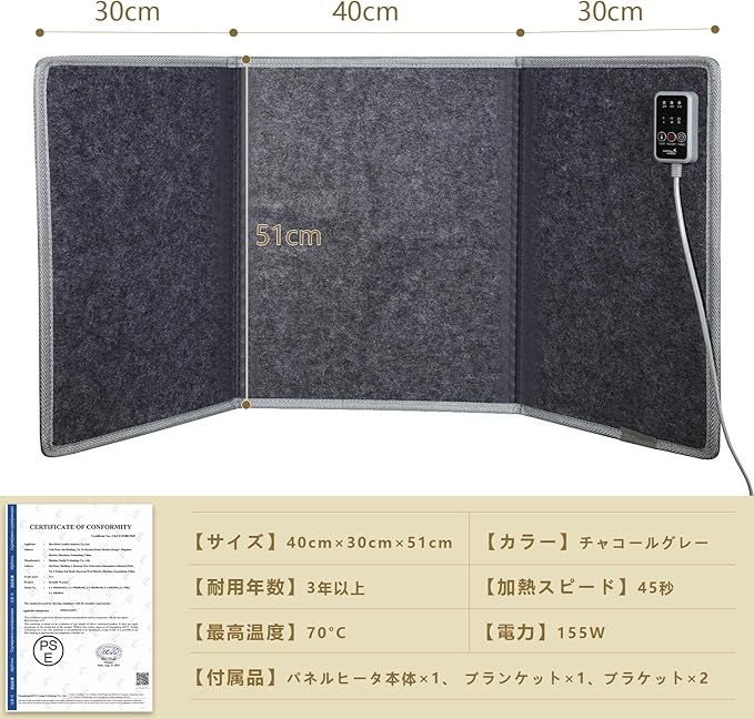 【Jovirkパネルヒーター の6つのメリット】私たちパネルヒーター 足元安全性と快適性を兼ね備えた最新モデルです。万が一転倒しても自動で運転を停止し、無音・無臭設計で静かに暖まります。さらに、過熱防止機能と温度上昇時の自動停止機能を搭載し、安心してお使いいただけます。2時間後には自動で電源がオフになる省エネ設計で、従来品より温度効率が約50%アップ、消費電力は約30%カット。柔らかい毛布をプレゼントとして付属しており、併用することで保温効果がさらに向上します。日本語取扱説明書付き、PSE認証済みで、1年間の製品保証も付いています。