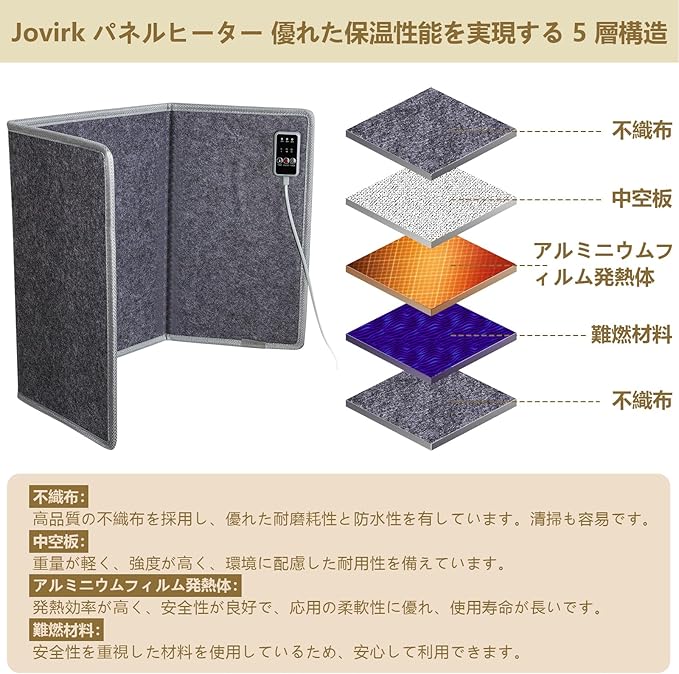 【驚きの速暖性と省エネ性能 進化したパネルヒーター】私たちパネルヒーター 足元 5層構造を採用して優れた保温性能を実現しています。高品質な不織布は耐摩耗性・防水性に優れ、清掃も簡単。中空板は軽量で丈夫、かつ環境に配慮した耐久性を備えています。アルミニウムフィルム発熱体は加熱効率が高く、安全性に優れ、長寿命です。さらに、阻燃材料を使用することで、安心してご使用いただけます。