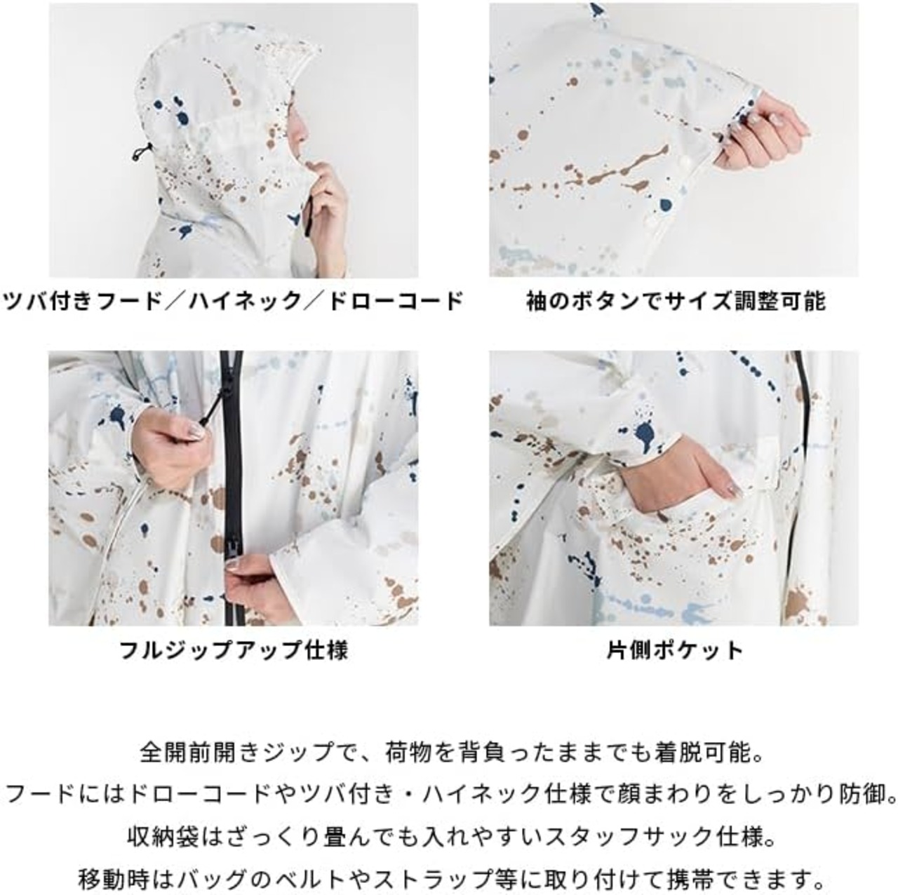 フード部分はツバ付き・ハイネック仕様、調節可能なドローコード付