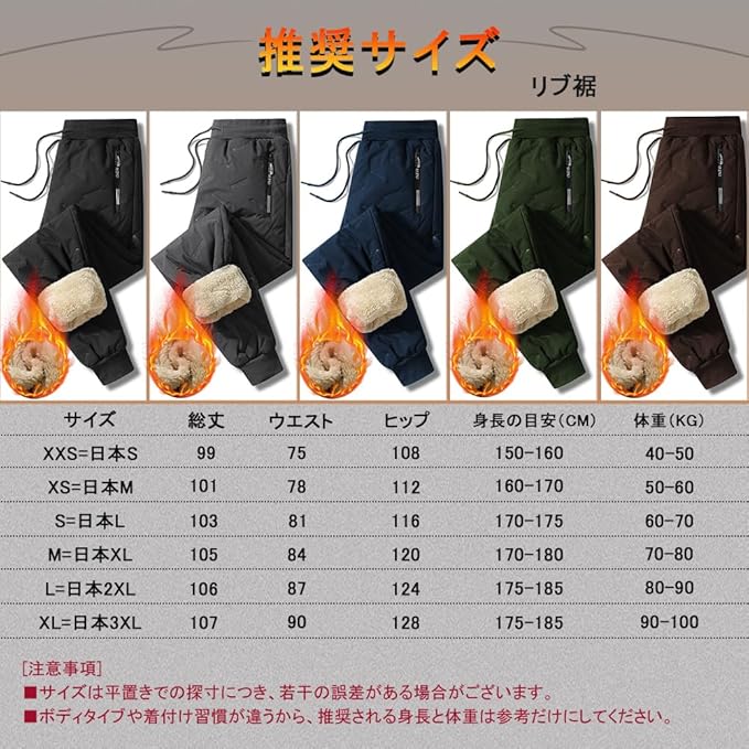 【発熱性と保温性が抜群】上質な裏起毛パンツはソフトで肌触りがよく、ぴったりとフィットし。撥水加工をプラスした表地は、少々の雨や雪の日でも着用できます。防風、保温効果に優れているため、極厚裏起毛ありで保温性が最高のイージーパンツです、真冬でも耐えられる。