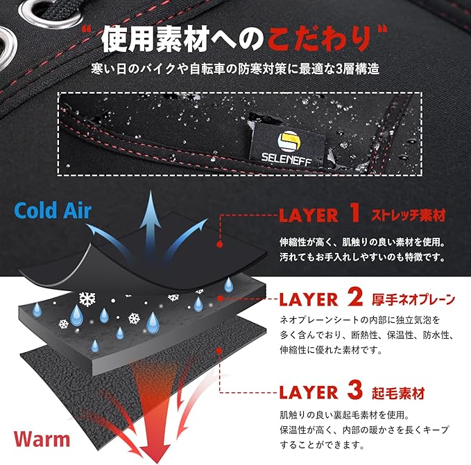【高品質な3層構造】バイクハンドルカバーの素材にもこだわり、防寒対策に最適な3層構造を採用。外側には伸縮性が高く、肌触りの良いストレッチ素材を使用し、汚れた際のお手入れも簡単。内部にはネオプレーン素材を使用し、断熱性・保温性・防水性・伸縮性に優れ、寒さをしっかりブロックします。さらに、ハンドルカバーの裏地には起毛素材を使用し、優れた保温性で内部の暖かさを長時間キープし、冬の厳しい寒さでも快適な操作性を実現します。