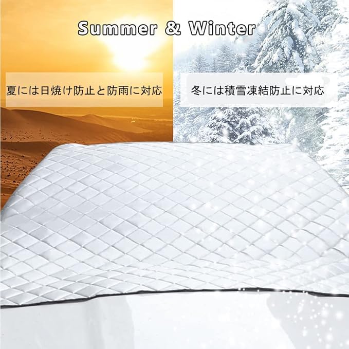 【四層構造】表面材料はPEVAアルミ箔で、傷つきにくいで耐久性があります。また防水性もあり、雪、雨、霧、氷などからカーフロントガラスを守ります。中身はクッションあるスパンレース綿と複合綿で作られます。保温性と難燃性が強く、凍結防止はもちろん断熱性もあります。裏面は不織布で、ご愛車を傷つけません。