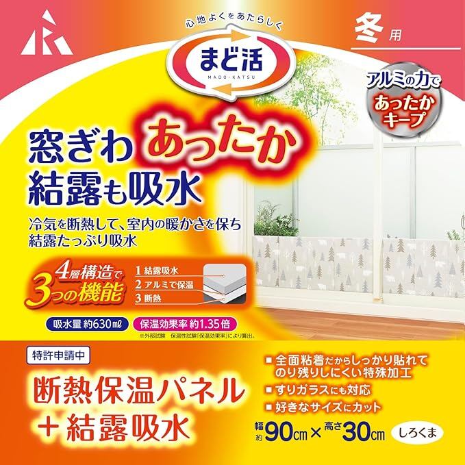 このパネル1枚で、窓の断熱・保温・結露対策をまるごとカバー。冷気を遮って室内の暖かさを逃がさず、アルミ層が暖房の熱をしっかり反射。さらに吸水層が約630mlの結露を吸い取り、窓まわりを快適に保ちます。貼るだけで冬の悩みをまるごと解決!