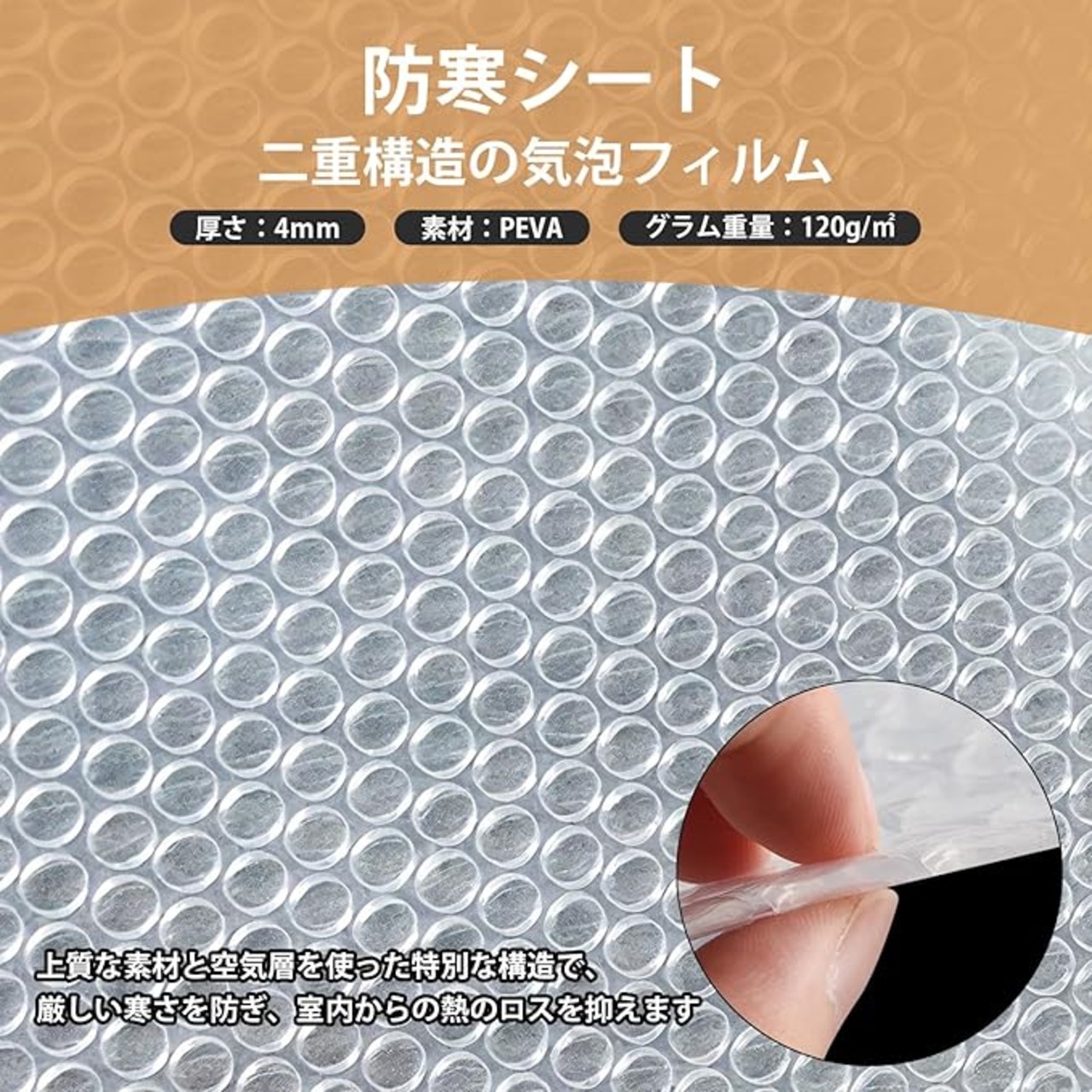【商品仕様】防寒気泡シートサイズ:120*150cm。素材:4mm厚のPEVA。グラム重量:120g/m 。また、6mマジックテープが付属していまするので、必要に応じて任意の形にカットすることができます