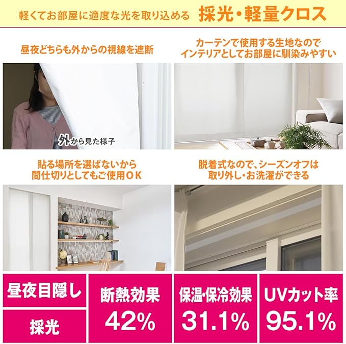 (採光・軽量クロス)機能:遮光率92% / 昼夜目隠し / UVカット率95.1% / 断熱効果42% / 保温保冷効果31.1% 組成:ポリエステル100% ウォッシャブル