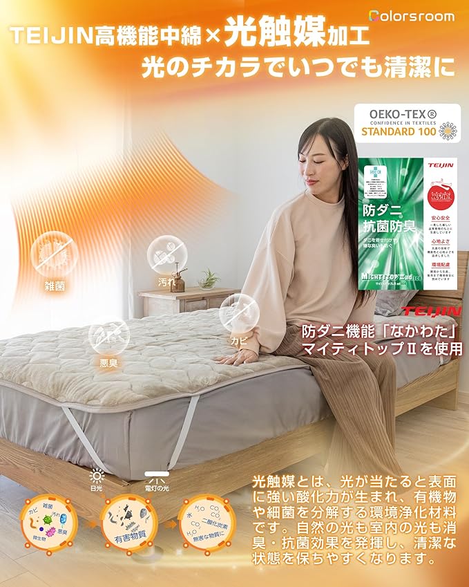 【TEIJIN高機能中綿を使用】TEIJINのマイティトップⅡは中綿そのものが「優れた抗菌防臭効果」と「防ダニ機能」を持っているので、菌の増殖によって嫌なニオイの発生を防ぎます。