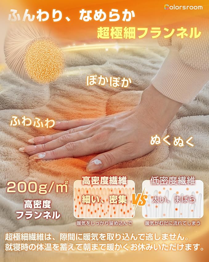 【ぬくもりが続くマイクロファイバー】超極細繊維のマイクロファイバーは、特別な構造によって隙間に暖気を取り込んで逃しません。就寝時の体温を蓄えて朝まで暖かくお休みいただけます。