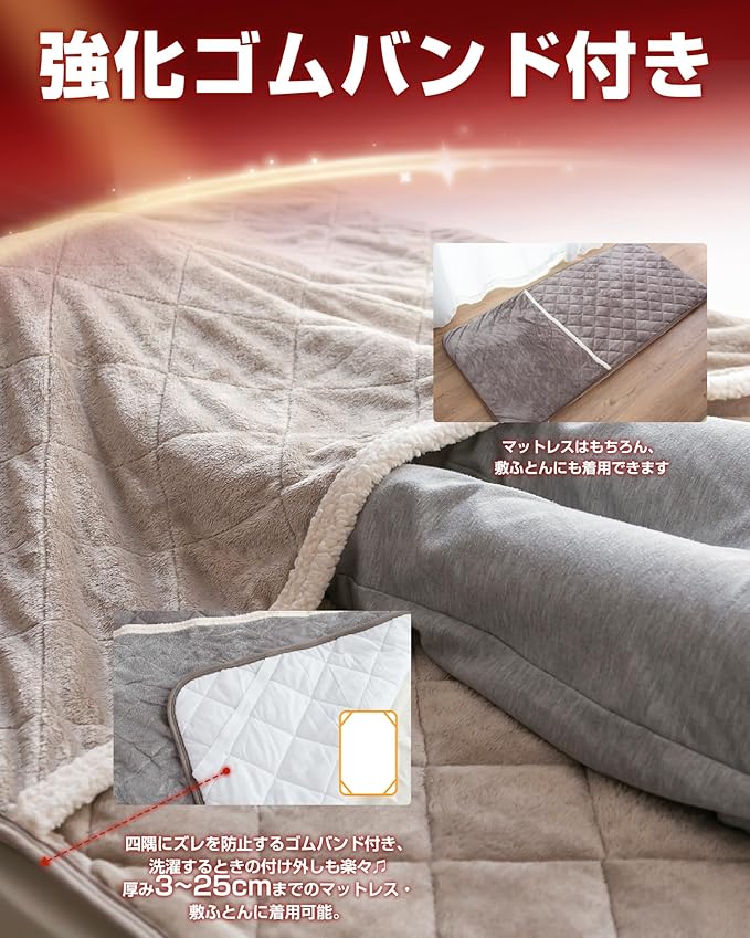 【断熱保温の厚手タイプ】180g/㎡たっぷり中綿入り、従来の敷きパッドよりも厚みを感じられます。これほどの厚みは熱を逃がしにくく、底付き感も軽減します。さらにふんわり中綿が熱をため込み、下からの冷気を遮断できます。
